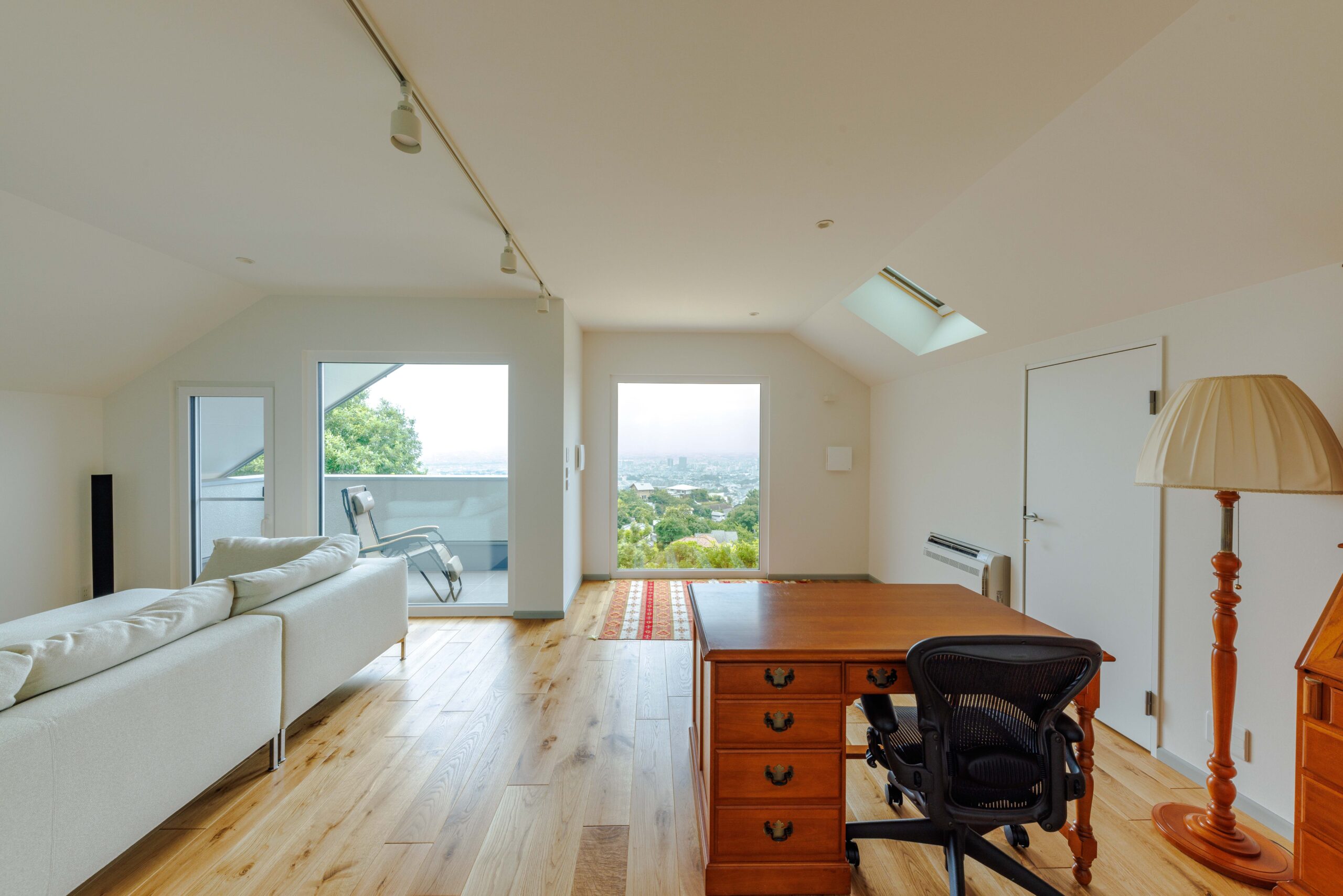 ・勾配屋根に従うかたちのリビングの高い吹抜け空間