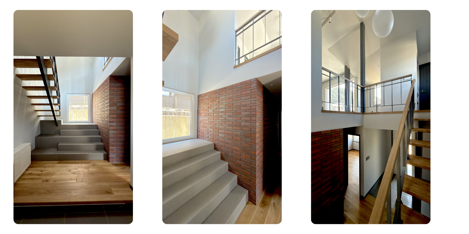 1階廊下と階段壁には無釉の本レンガを採用。